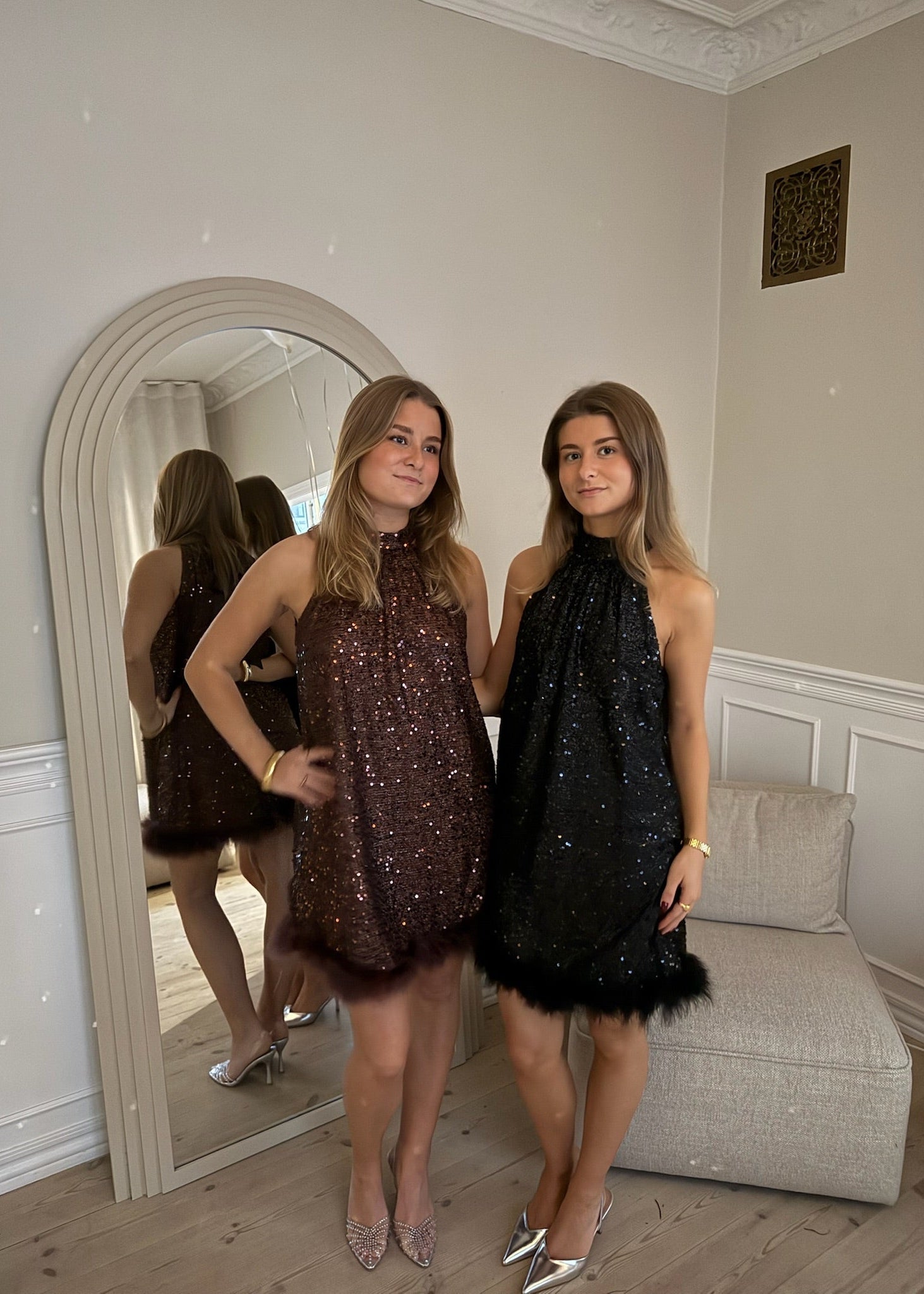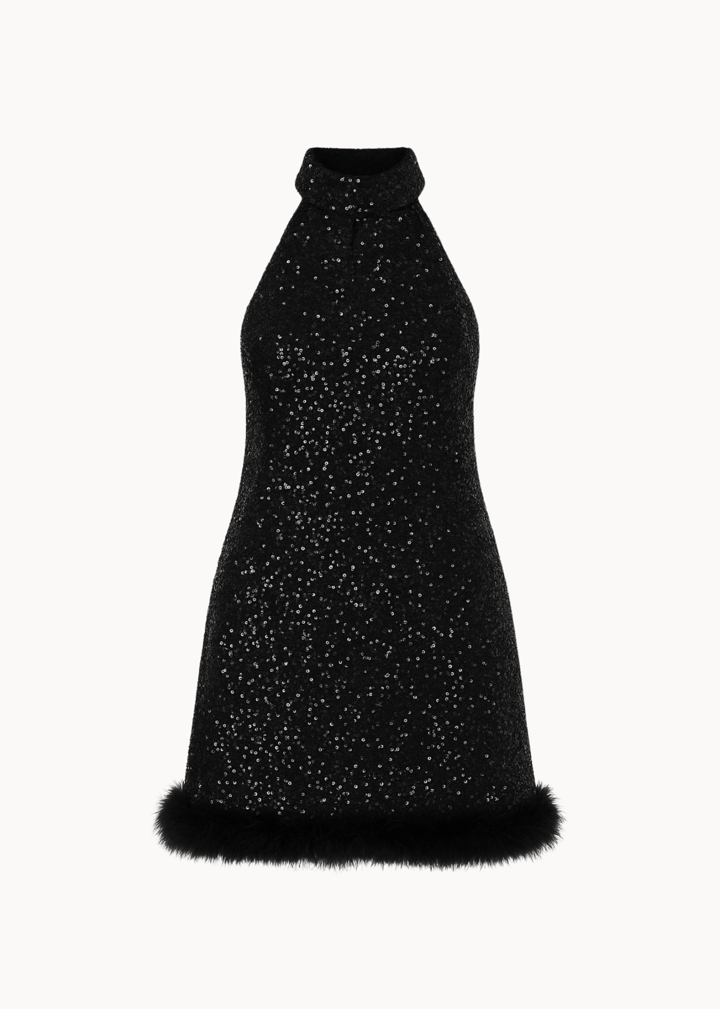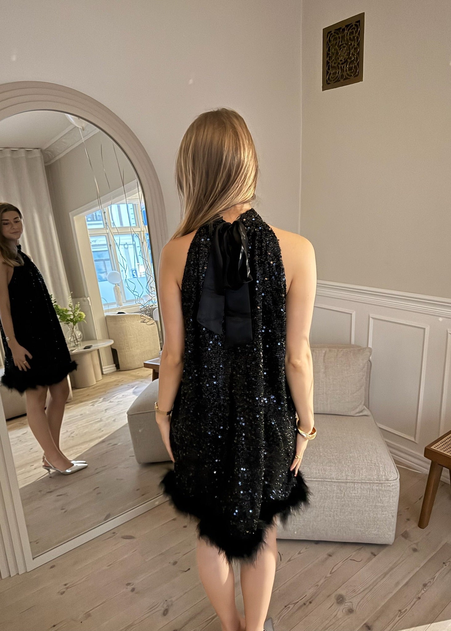 Our Thea Sequin Dress is the perfect party dress, filled with sparkling sequins. The dress has an elegant halterneck and a beautiful back, which closes with a ribbon at the neck and creates a nice bow. The dress is adorned with luxurious feathers at the bottom, and its looser fit, which goes just above the knee, gives a light expression🎀✨