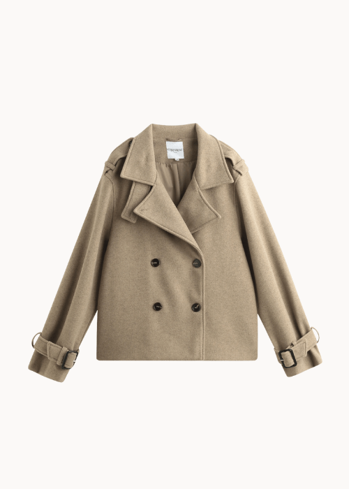 Vores nye Oline Kort Coat er en kort frakke i uldlook med dobbeltradet lukning og klassiske trench-detaljer. Med bred krave, spænder ved ærmerne og skulderstropper får du et sofistikeret men moderne udtryk. Den brune farve gør jakken perfekt til efteråret og vinteren🤎🍂