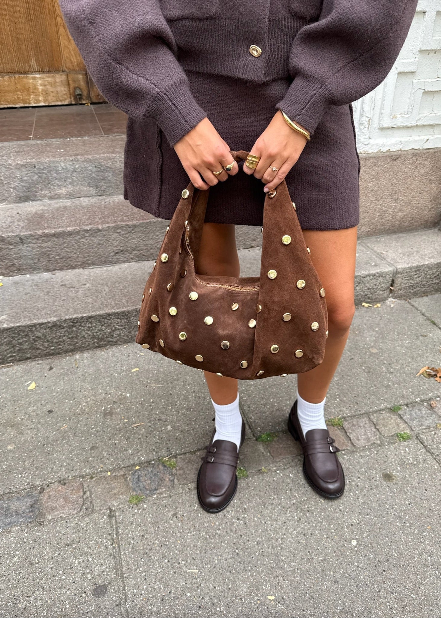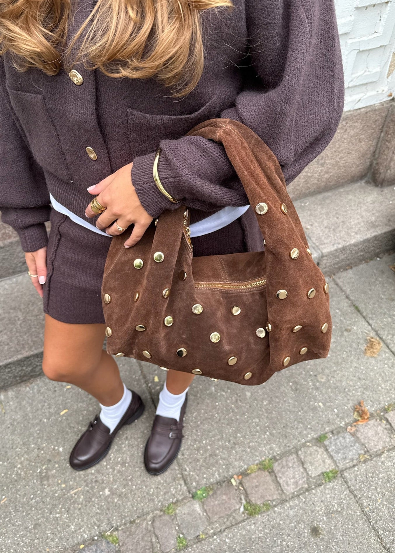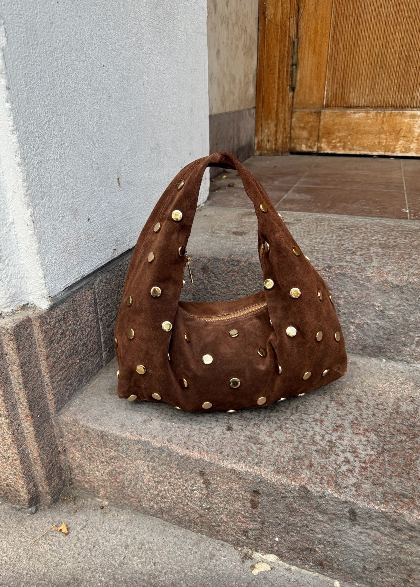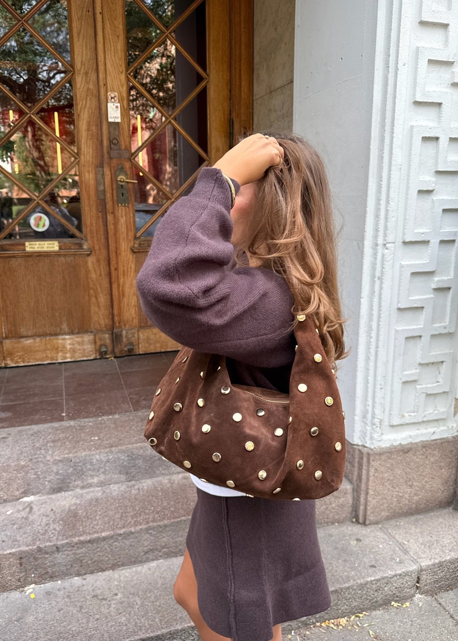 Siena Taske Med Nitter er en medium skuldertaske i blødt ruskind med dekorative guldfarvede nitter. Tasken har en rummelig form med lynlåslukning, indvendig lynlåslomme og brede stropper, der gør den behagelig at bære.✨