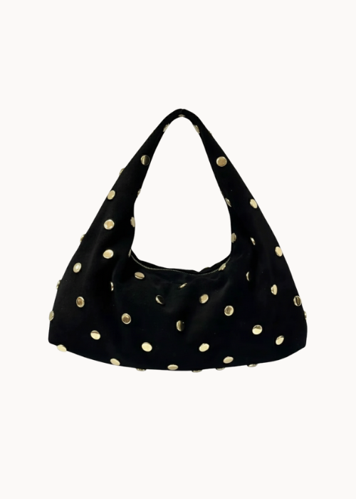 Siena Taske Med Nitter er en medium skuldertaske i blødt ruskind med dekorative guldfarvede nitter. Tasken har en rummelig form med lynlåslukning, indvendig lynlåslomme og brede stropper, der gør den behagelig at bære.✨