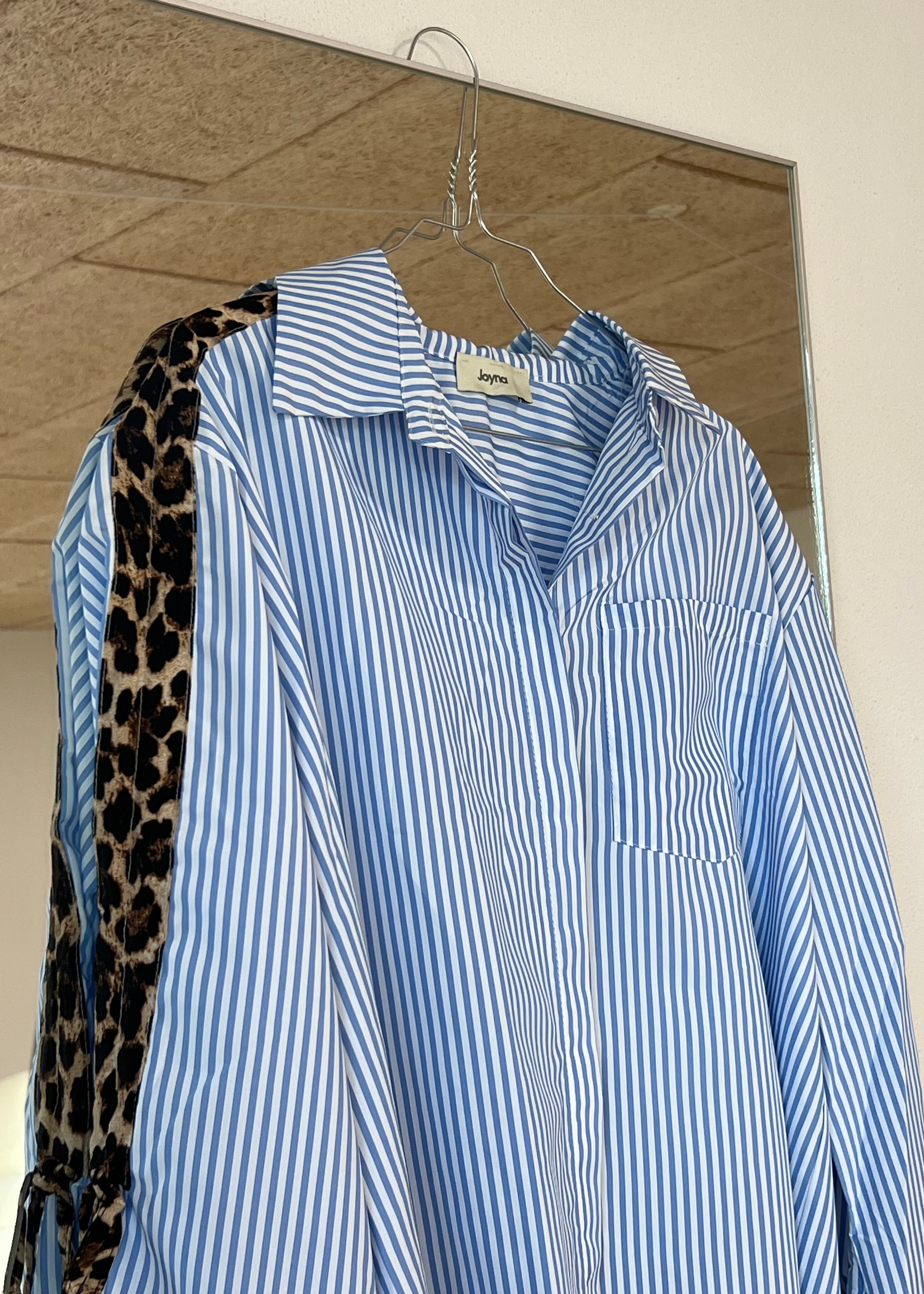 Our Striped Leo Shirt is a modern and stylish shirt in blue and white stripes. It has a narrow leopard stripe down the side of the arms, which can be tightened and tied. This adds a unique twist to the classic design🤎