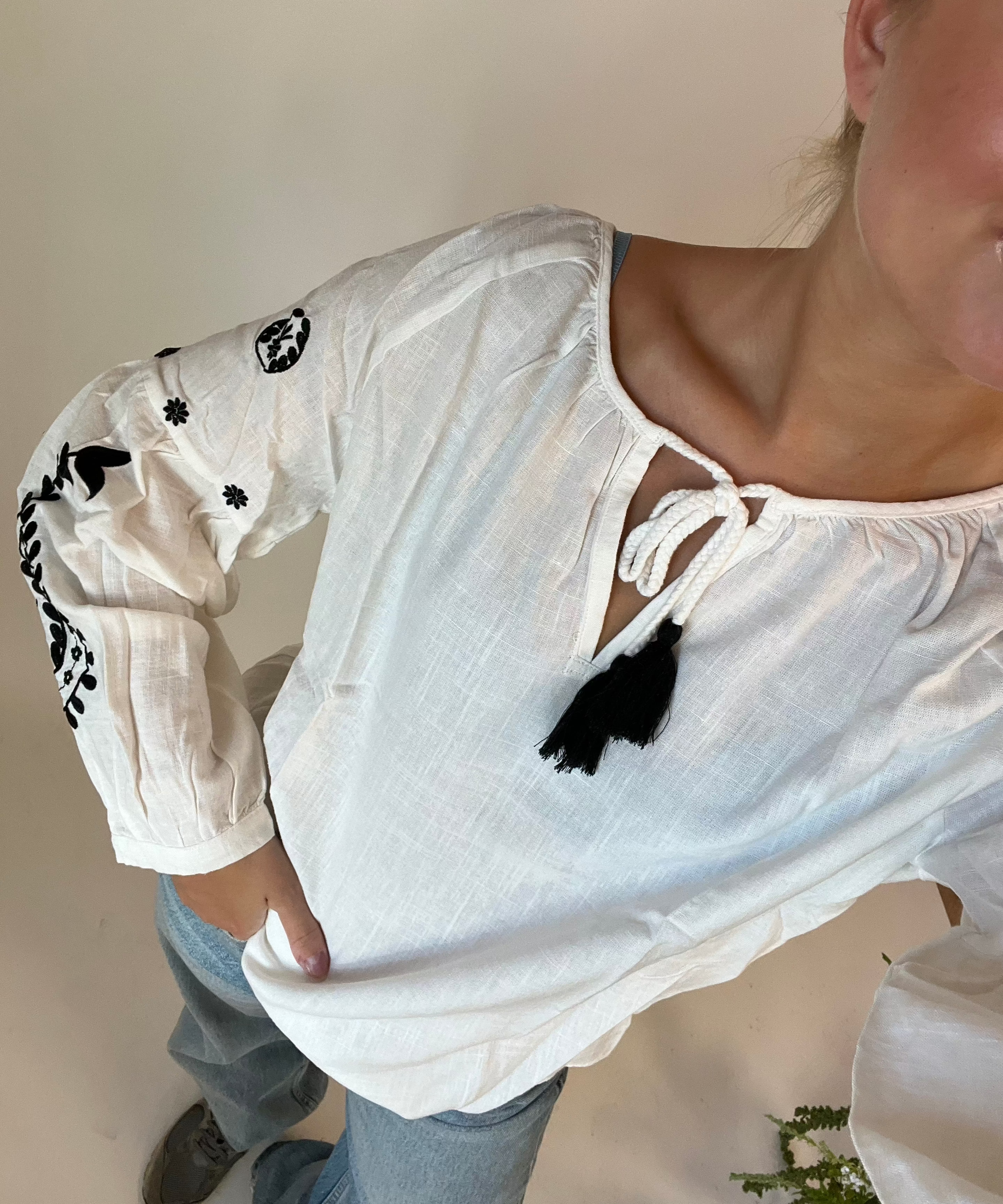 Vores Vilda Bluse med Bindebånd er lavet i et blødt, strækbart materiale, der former sig efter kroppen. Blusen har en klassisk pasform med lange ærmer, der får et let svaj ved håndleddene. En dyb V-udskæring foran mødes af et elegant bindebånd, der skaber en smuk knude og fremhæver taljen på fineste vis🌸