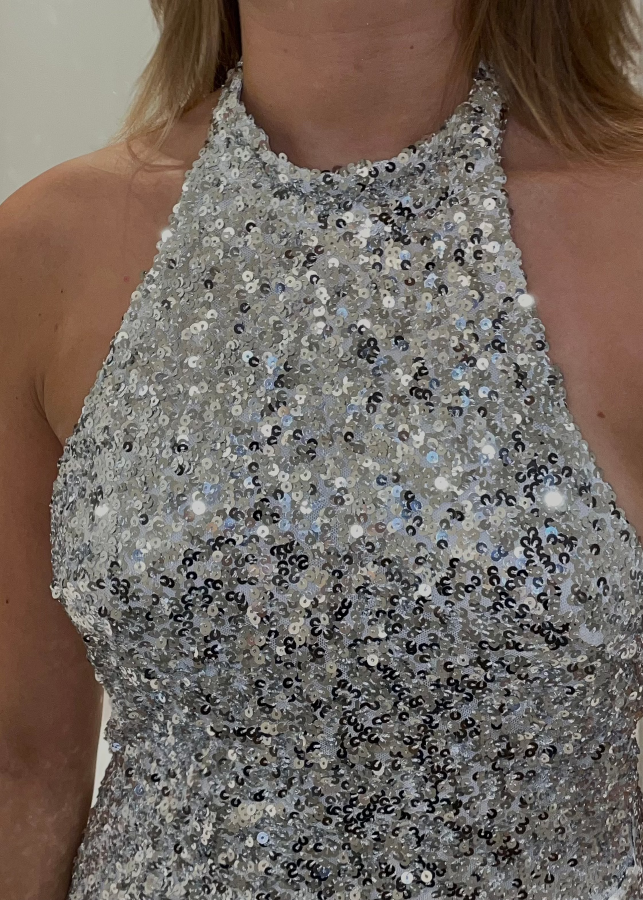 Our Lily Sequin Dress is the perfect mini dress, filled with sparkling sequins. The dress has an elegant halterneck and a beautiful, open back. In addition, the dress has a tight fit and a draping detail on the side🎀✨