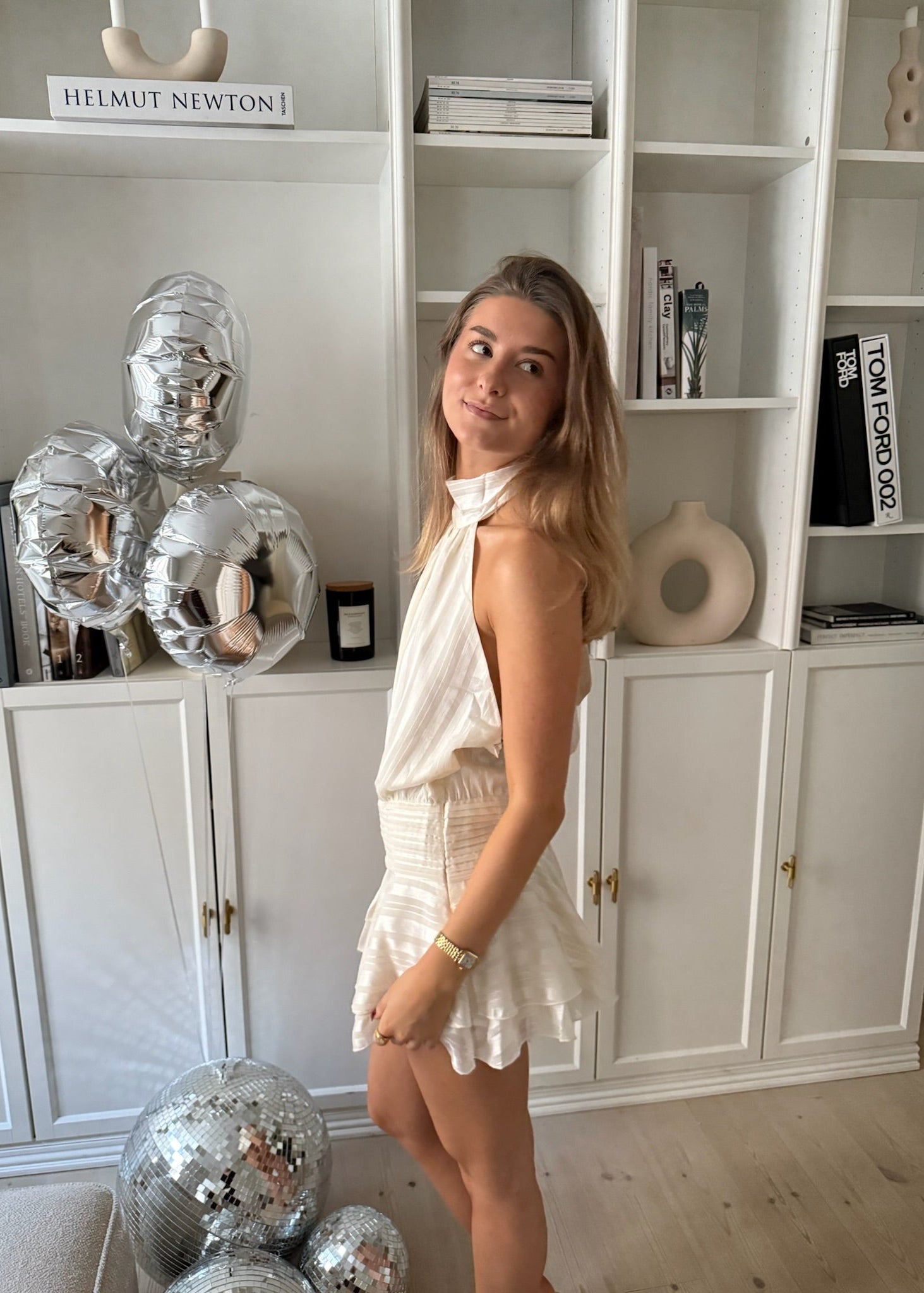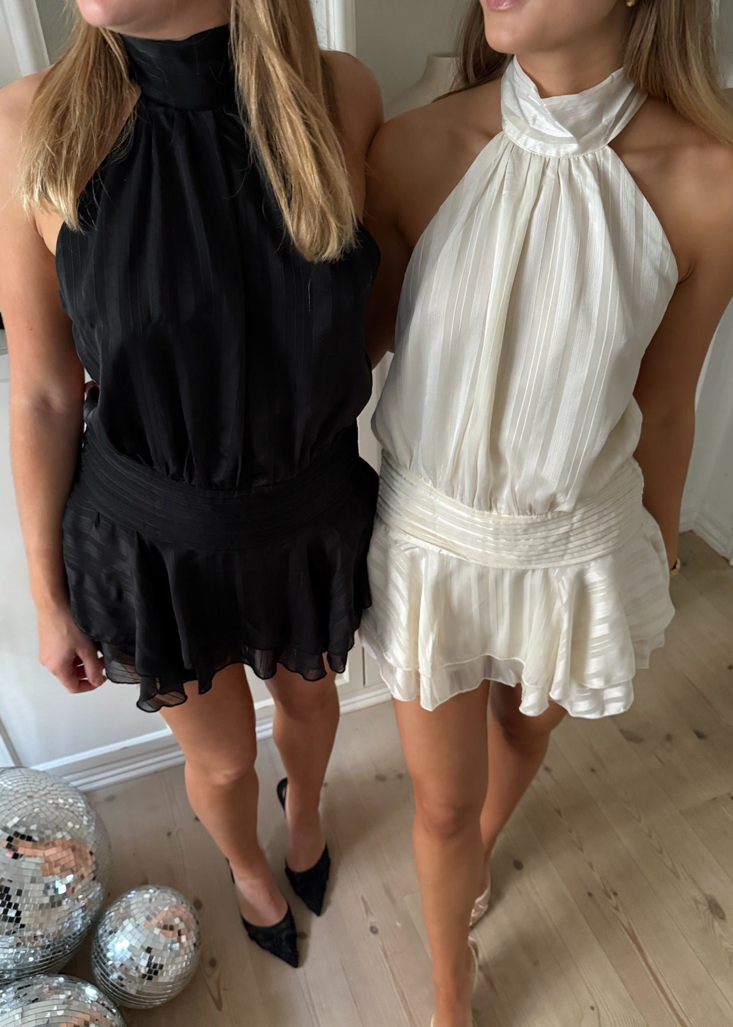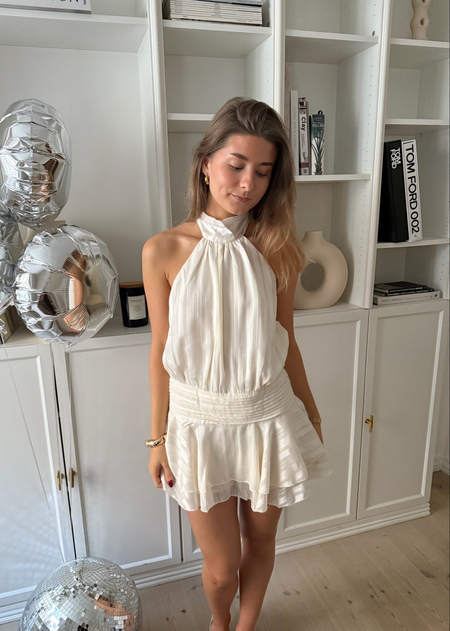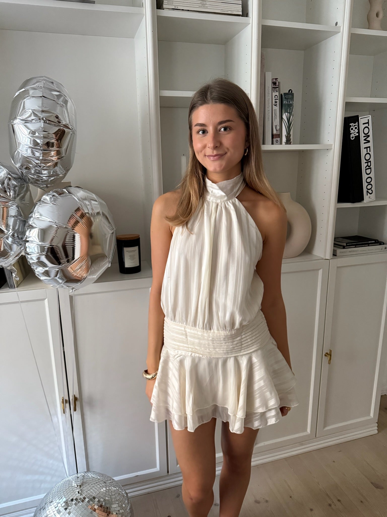 Nora Flair Mini Dress is an elegant and feminine dress designed in a beautiful satin-look quality with a discreet striped structure. It has a halterneck closure, a loose and draped top and a defined waist that creates a flattering silhouette. The skirt consists of two layers, which gives a light and festive fall and creates beautiful movement✨