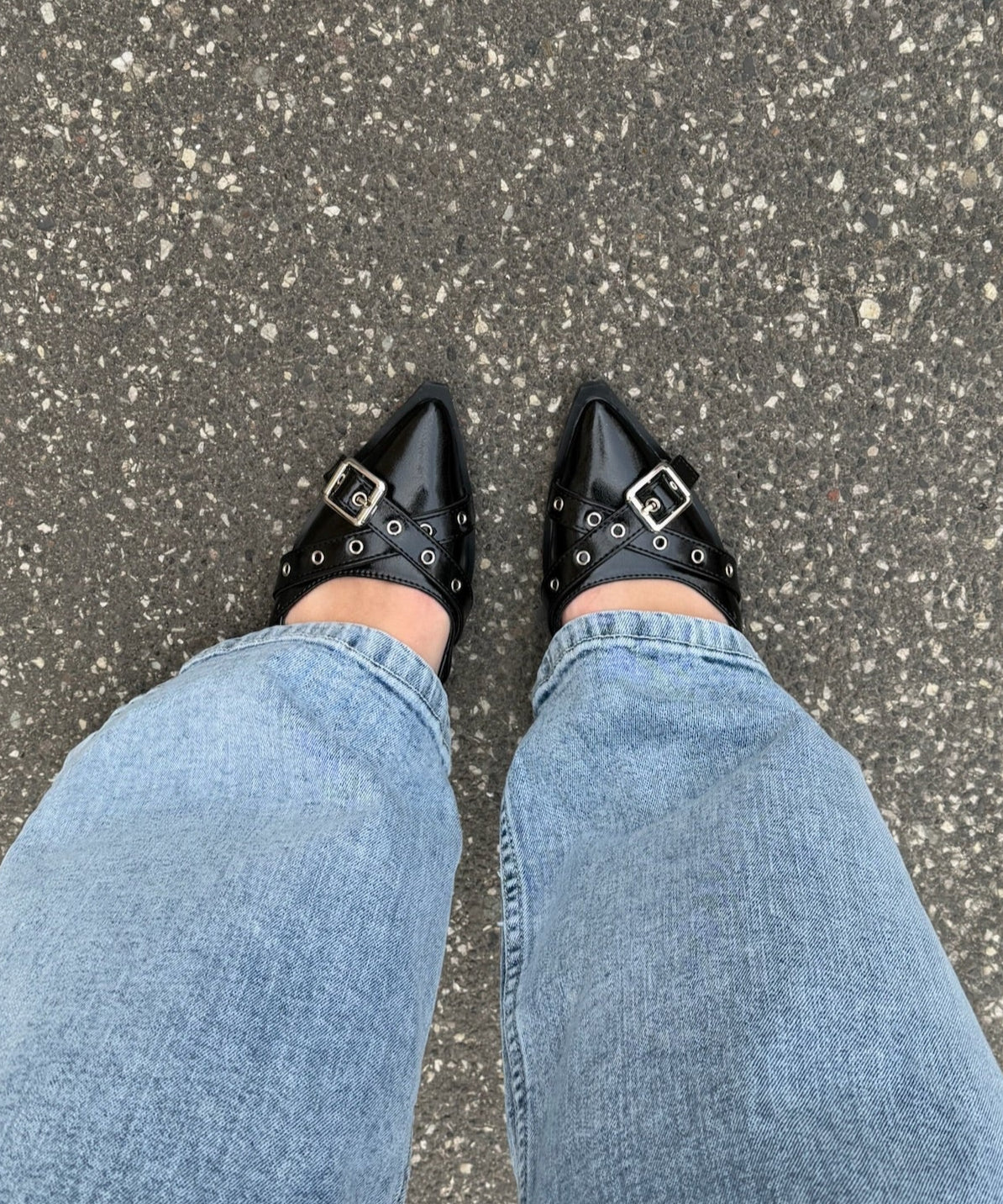 Our Seline Slingbacks are a pair of flat slingbacks with an adjustable strap and chunky buckles that cross at the toe. They are perfect for a city trip, but with their comfortable fit and stylish look, they can also spice up your everyday outfit🖤⚡️
