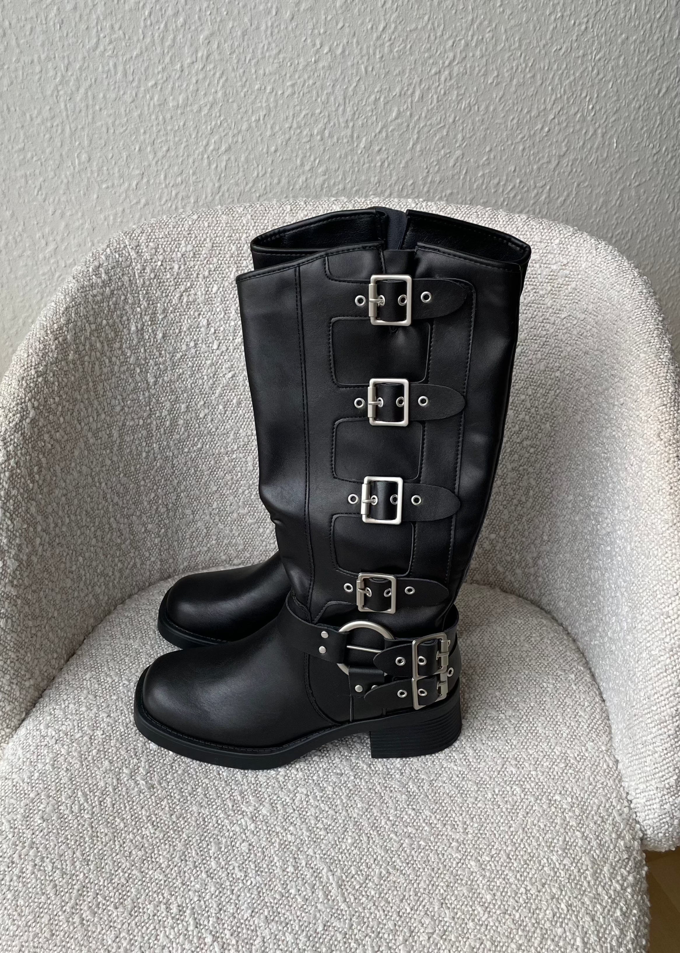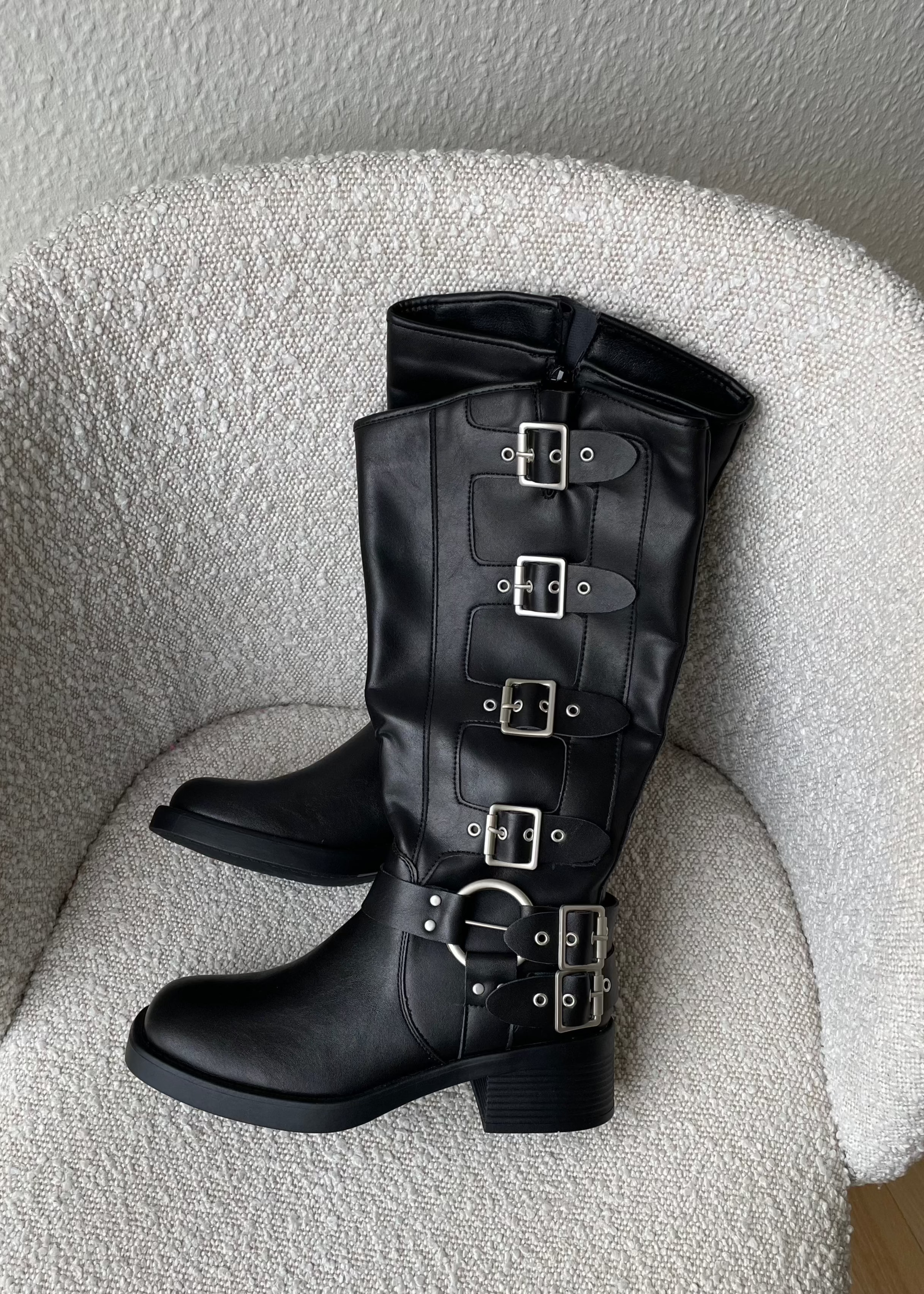 Our Biker Boots are available with both high and low shafts. The high ones go to the middle of the shin. They also have silver buckles and rivets, which give them a raw look. They go perfectly with a skirt🖤☀️