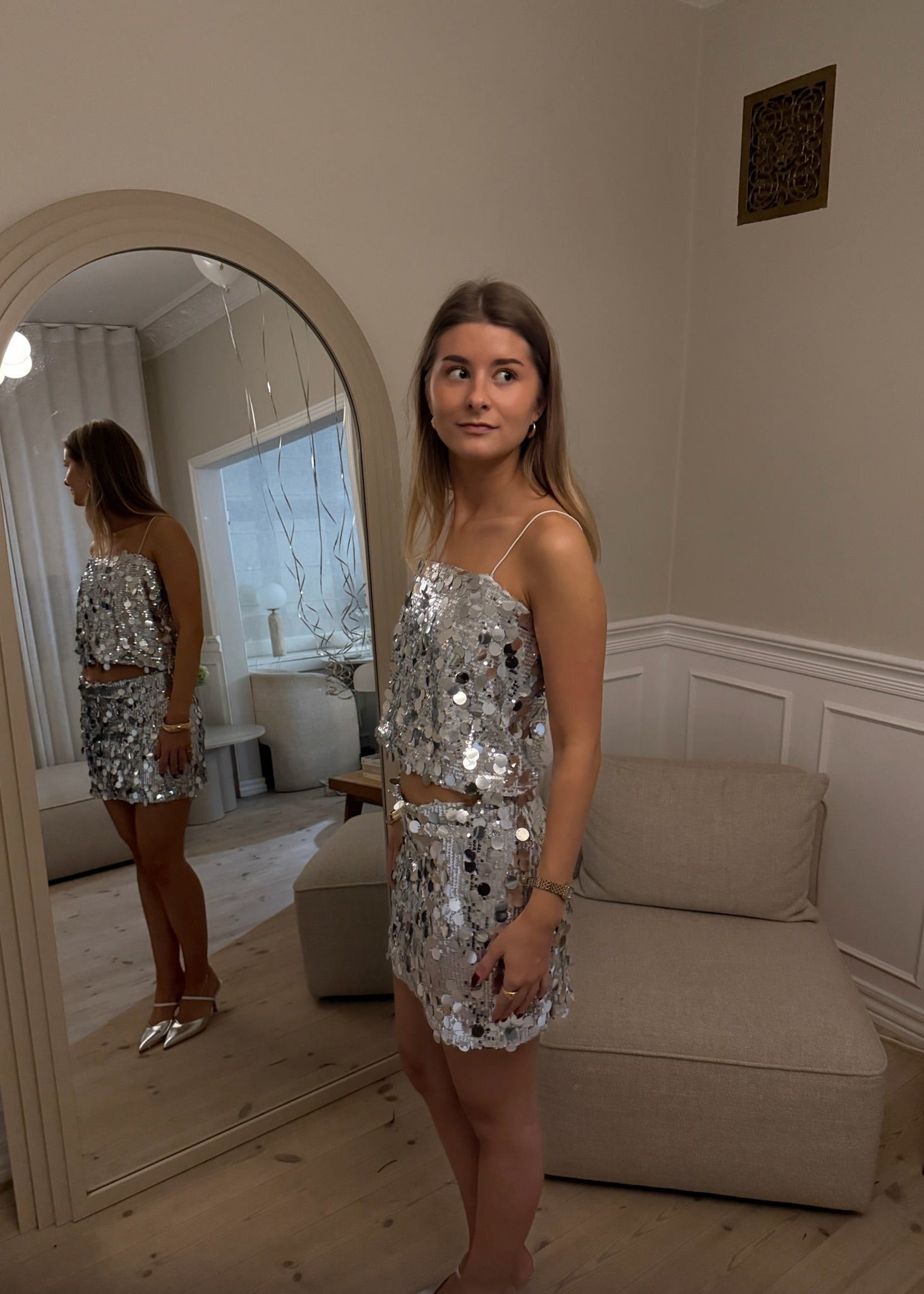Our Sequin Skirt is a mini skirt filled with large silver sequins that create a total wow effect. It does not scratch the skin, as the skirt is equipped with a soft lining. The tight fit highlights your silhouette, and with its eye-catching glitter, it is ideal for New Year's Eve or any festive occasion🥂✨