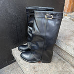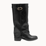 Our new Elina Cuff Boots are high boots in faux leather with an elegant cuff detail and decorative buckle. They have a stylish design with a comfortable low heel, making them perfect for both everyday wear and city walks.🖤