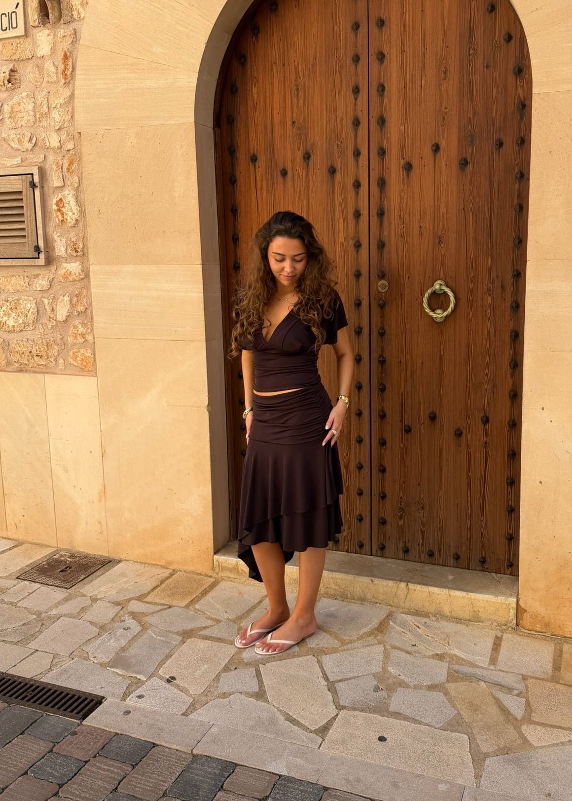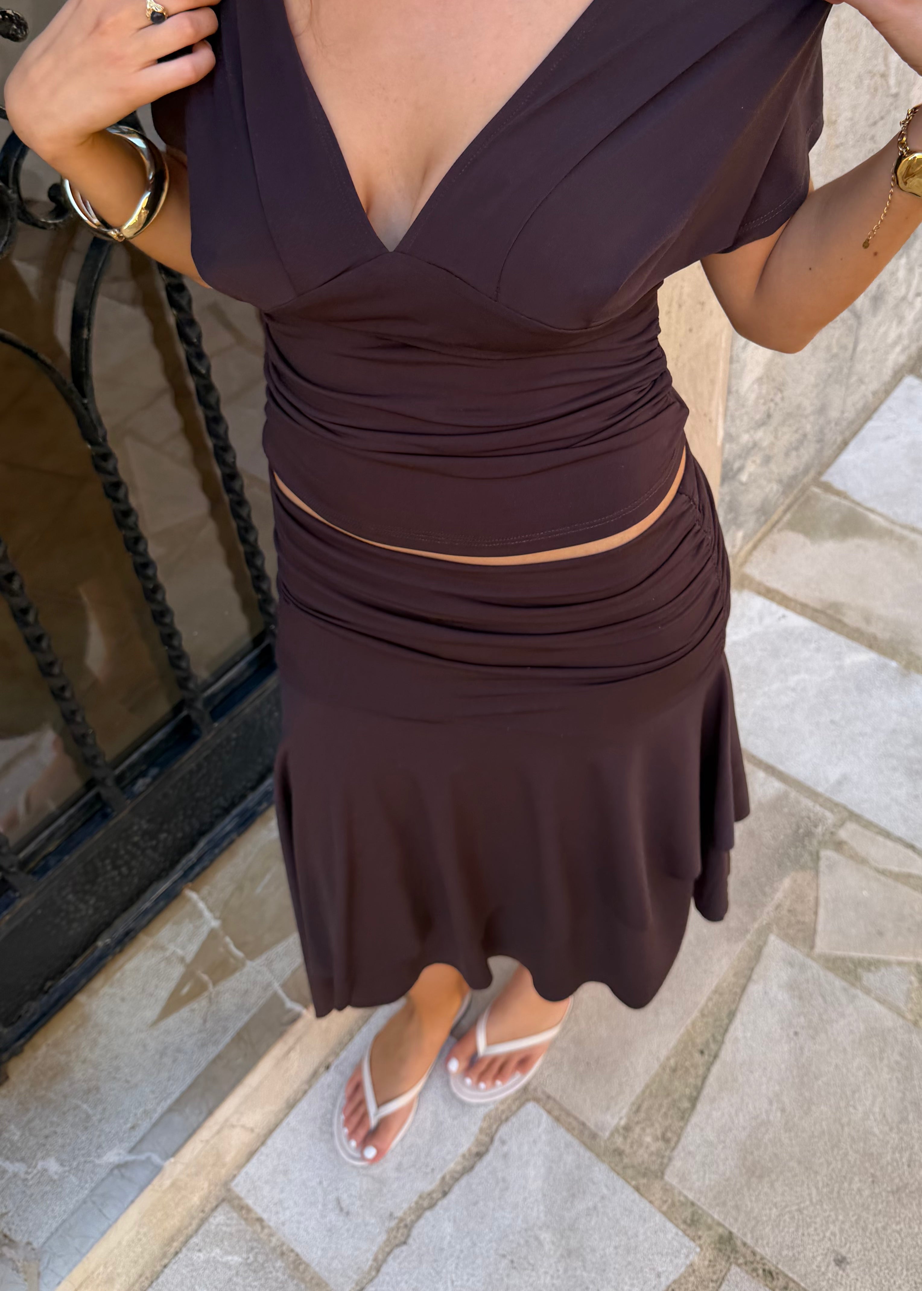 Cleo Draperet Top + Mini Nederdel - Mørkebrun - ByStenholt.dk
