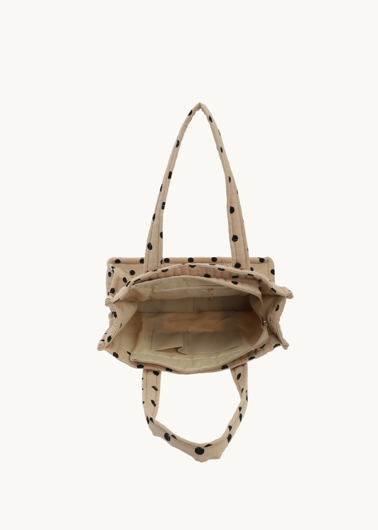 Vores Laura Prikket Net er en klassisk og rummelig stoftaske i 100 % bomuld, perfekt til forårs- og sommersæsonen. Tasken har et tidløst sort polkaprint, som giver et fint og sommerligt udtryk, der er nemt at style til både hverdag og ferie.