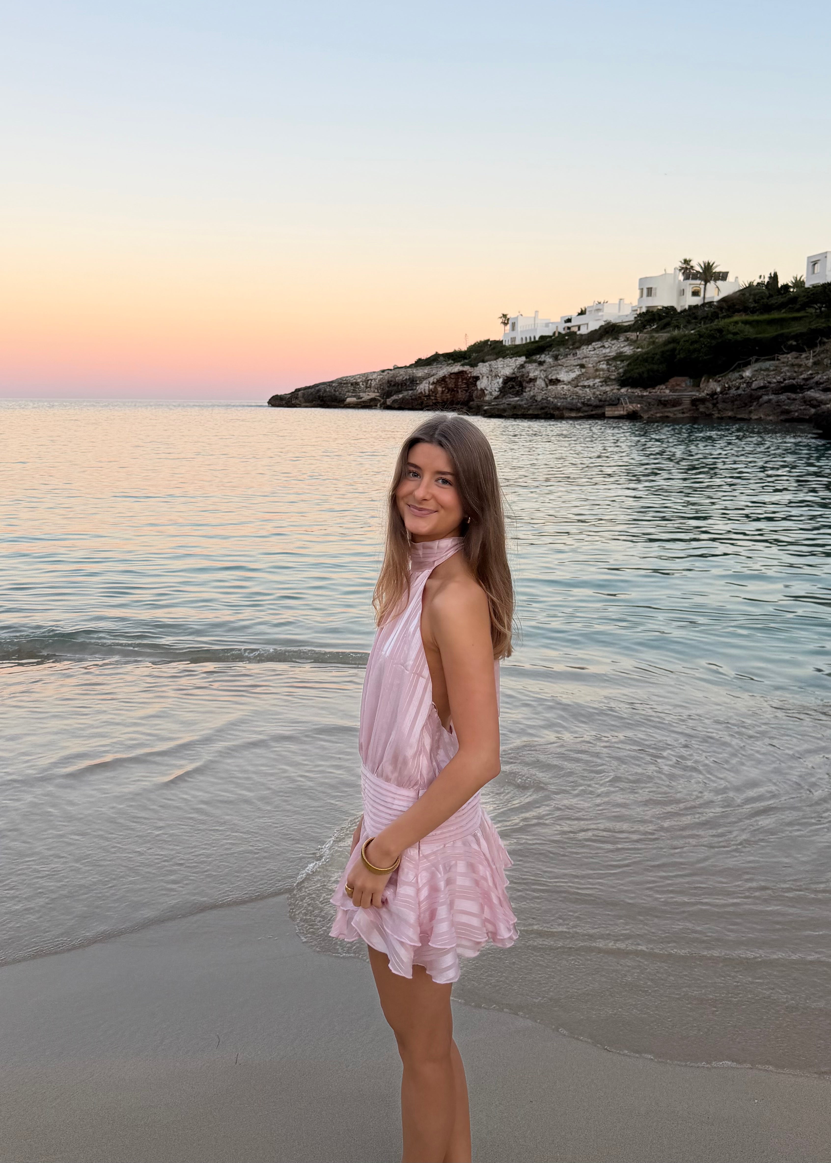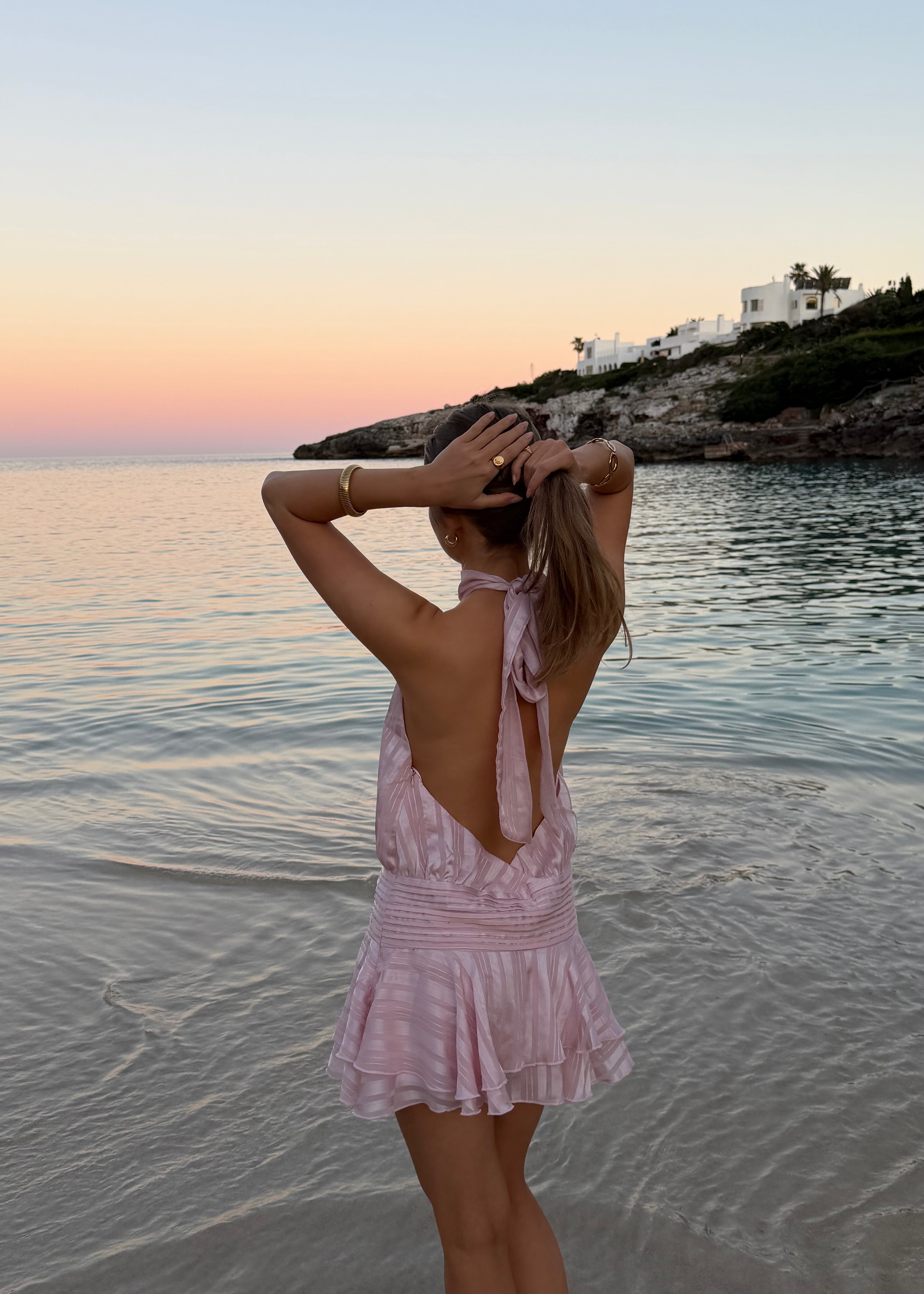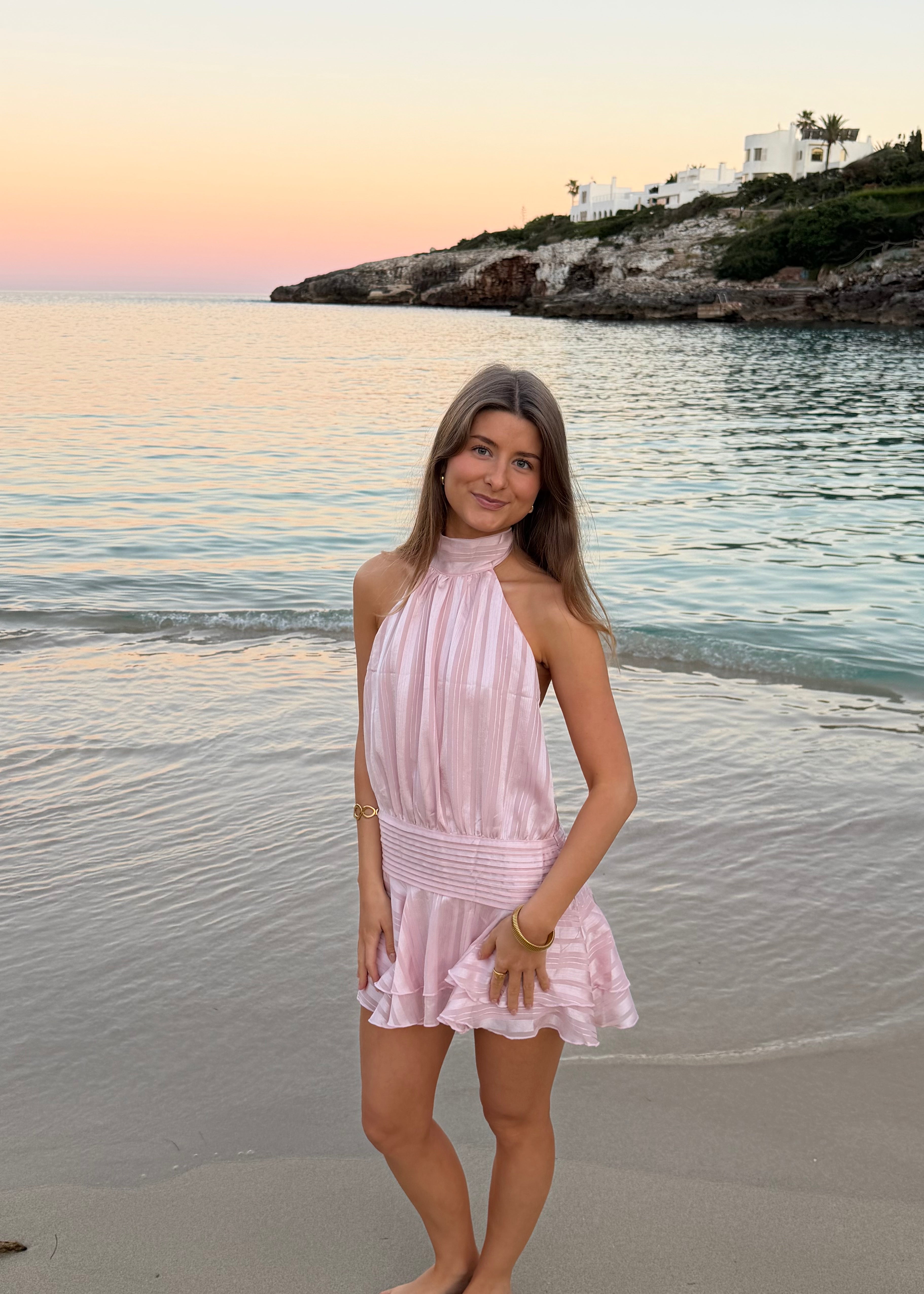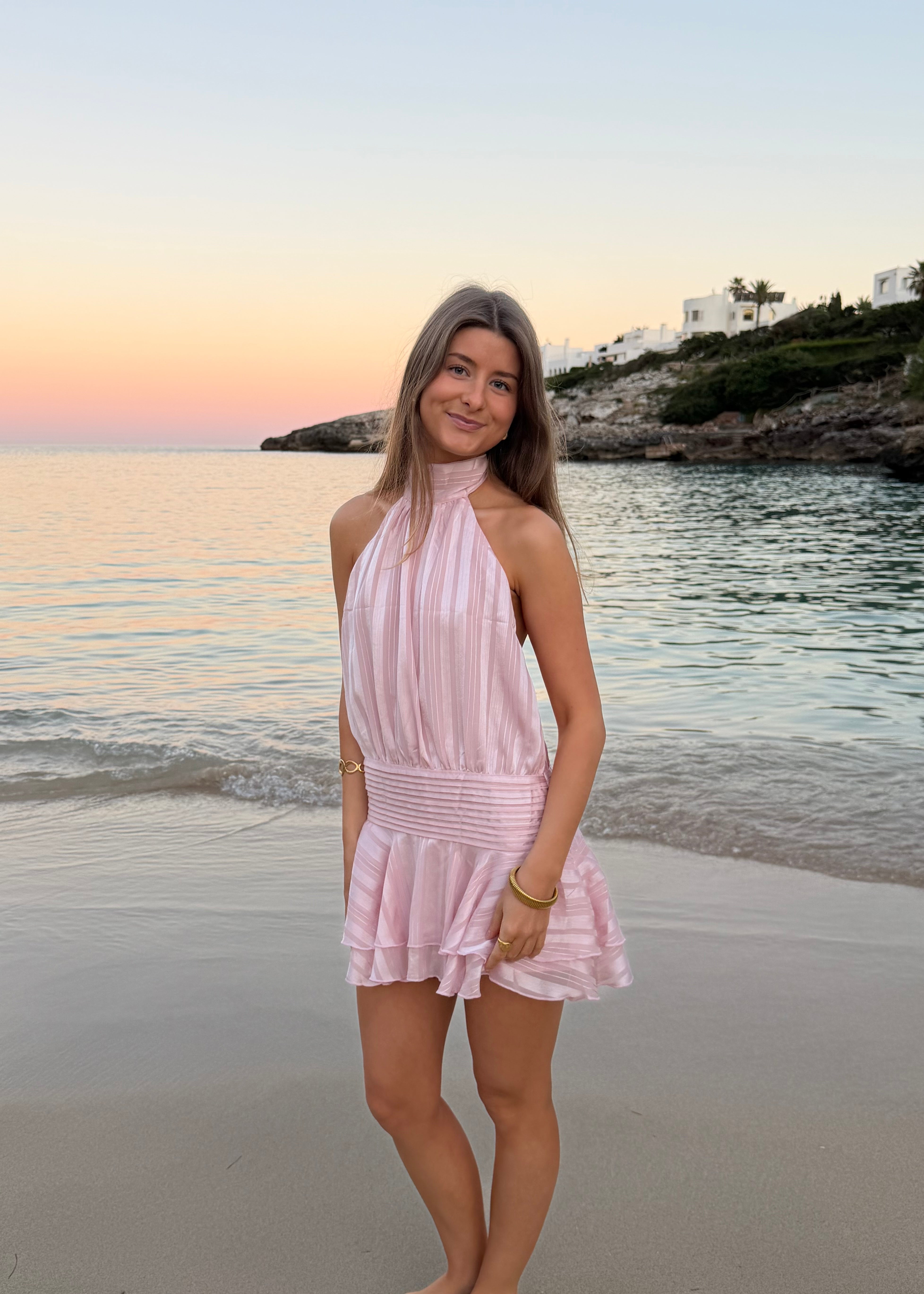 Nora Flair Mini Dress is an elegant and feminine dress designed in a beautiful satin-look quality with a discreet striped structure. It has a halterneck closure, a loose and draped top and a defined waist that creates a flattering silhouette. The skirt consists of two layers, which gives a light and festive fall and creates beautiful movement✨