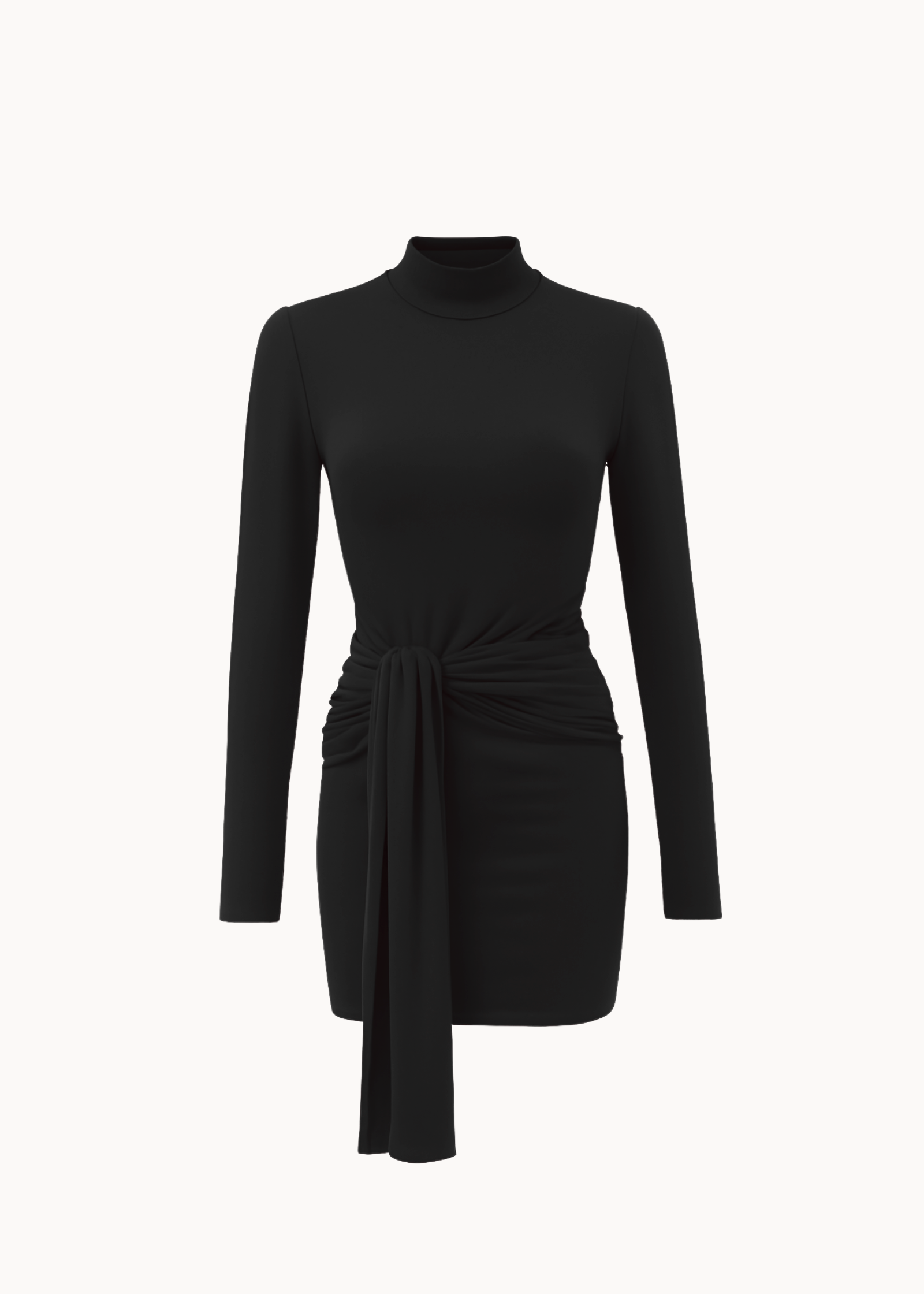 Vores Tie Waist Mini Kjole er en elegant og tidløs kjole, der kombinerer komfort og stil. Den tætsiddende pasform fremhæver figuren på en flatterende måde, mens det draperede bindebånd i taljen skaber et feminint og sofistikeret udtryk. Kjolen har lange ærmer og en høj hals, som giver et klassisk look med et moderne twist. Perfekt til både julefrokosten, en middag ude eller andre festlige anledninger✨